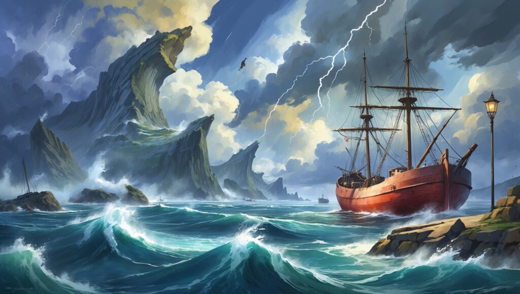 - The Storm Breaks Over Ridback Bay — jagged lightning over a fleet fighting the waves.