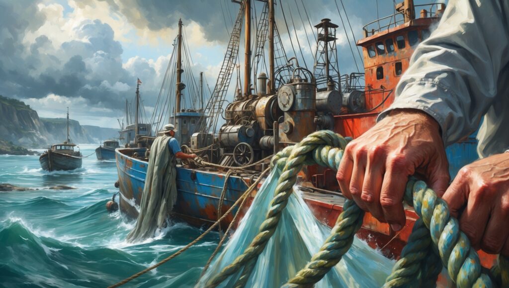 - Engines, Nets, and Salted Hands — rough textures, weathered ropes, and calloused palms.