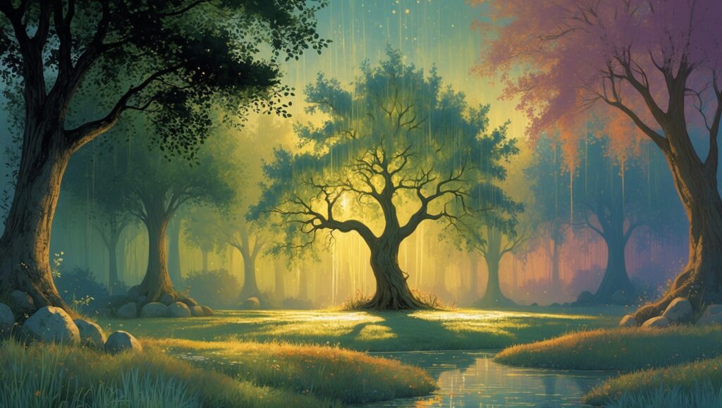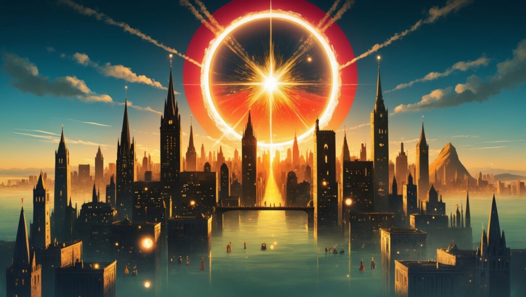 - Rising Tides, Rolling Dice — glowing dice-shaped clouds above a golden sea.